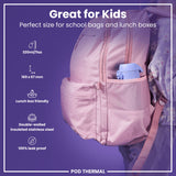 The perfect replacement for single use disposable cups. Small enough as a kids water bottle for their school lunch boxes or for smaller bags about town. The width of a soda can, it fits perfectly into all car cup holders and pockets on all backpacks.