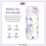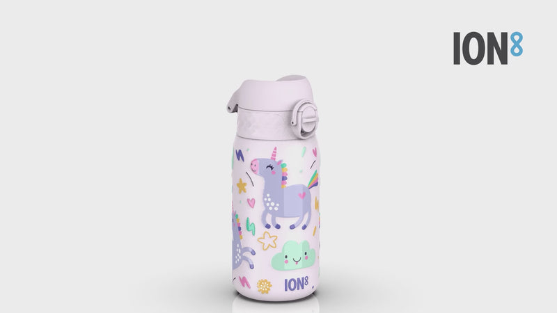 100% leak proof 320ml / 11oz vacuum insulated double wall stainless steel unicorn water bottle with a smooth flow for spill-free hydration and hygienic full-flip top cover for one handed use on-the-go. Keeps hot drinks hot and cold drinks icy cold and fresh for hours.