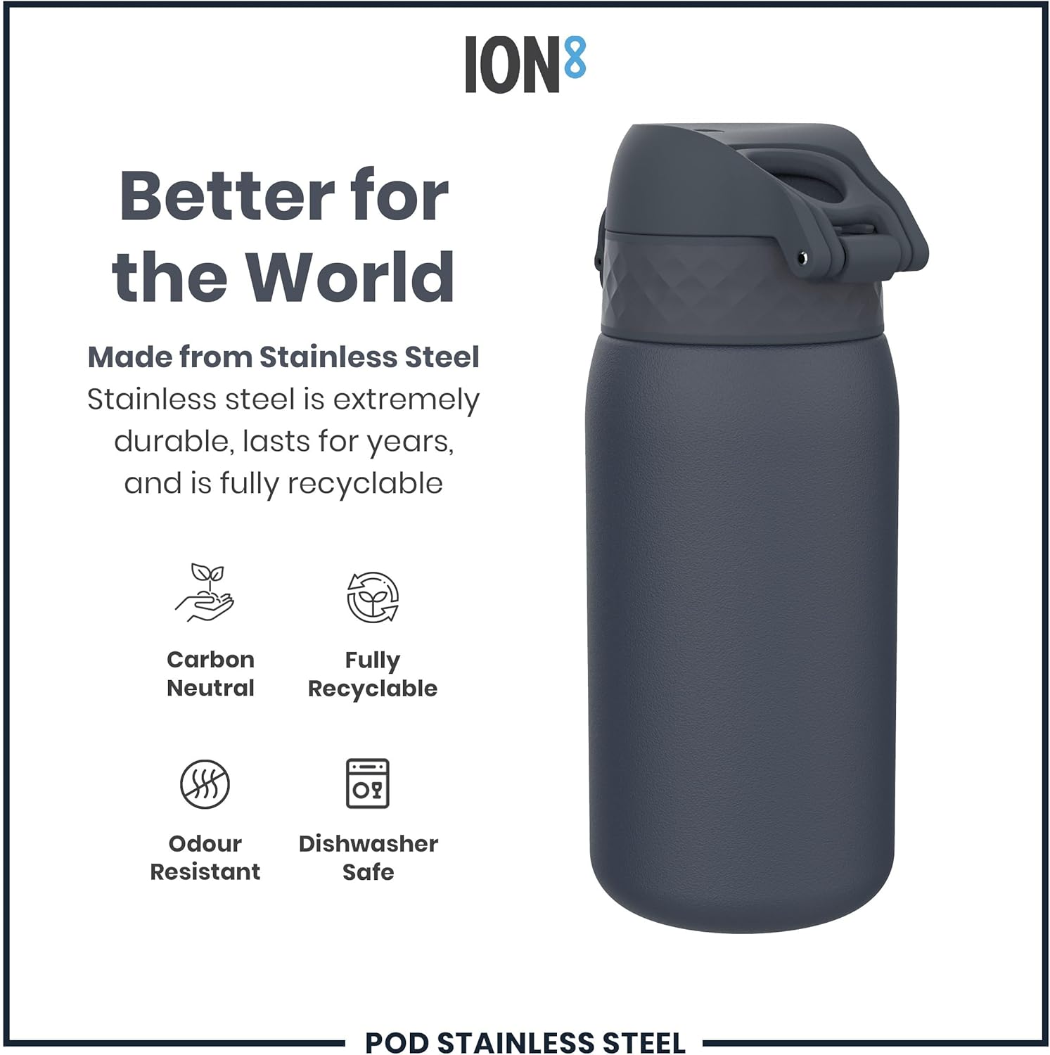 Made from lightweight stainless steel. Stainless steel is extremely durable, lasts for years, and is fully recyclable. This refillable and reusable drinks bottle is food safe, odour resistant, easy to hand wash, and keeps drinks fresh and full of flavour.