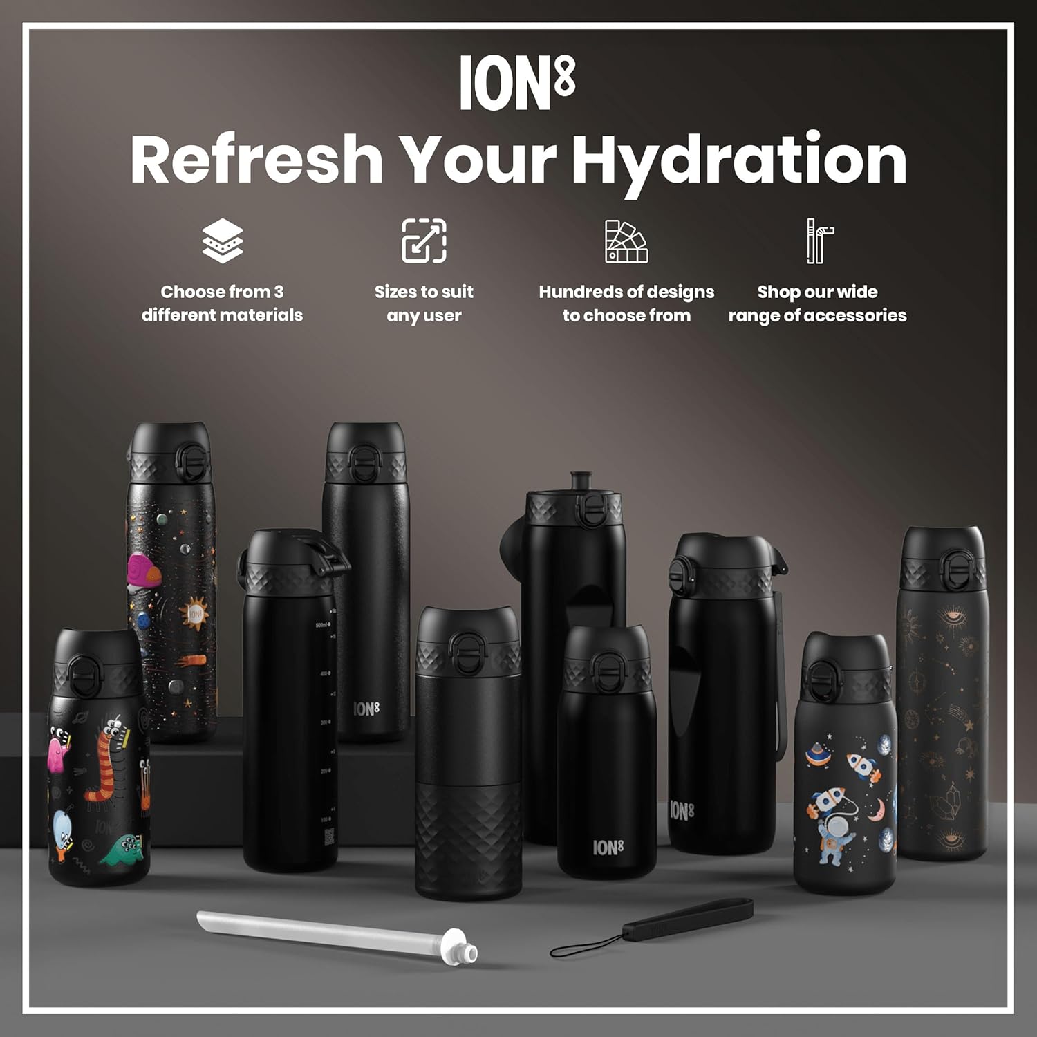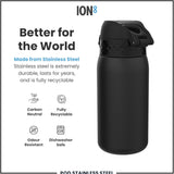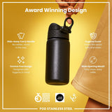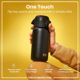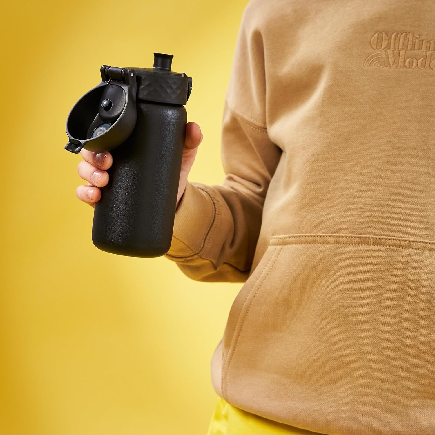 100% leak proof 400ml / 13oz stainless steel black water bottles with a smooth flow for spill-free hydration and hygienic full-flip top cover for one handed use on-the-go.