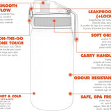 • One-Handed, Hygienic Sipping Designed for easy use, this spill-proof water bottle features a 240° flip lid that folds back fully for safe and easy sipping on the move. The smooth-flow spout ensures clean, one-handed drinking. Perfect for school or sports, this kids leak-proof bottle keeps drinks hygienic and mess-free - great for independent, active kids