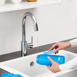Rinse the bottle and cap with cool water before use. After use, rinse with warm water and dish soap only. Do not scrub with brushes or abrasives. Air dry thoroughly before storage with the cap off. Hand wash or use a dishwasher on a cool wash cycle.