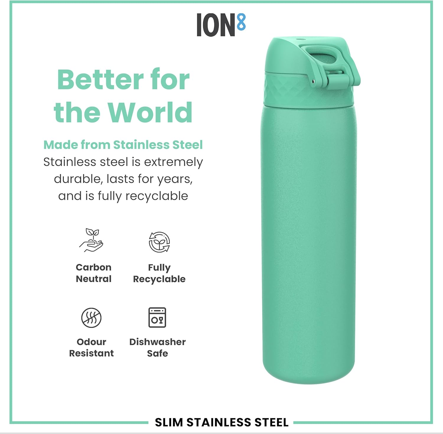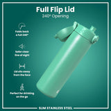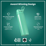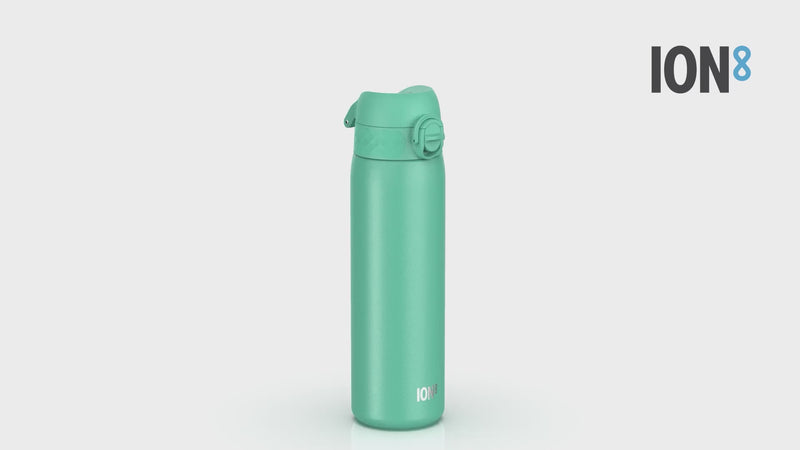 ION8 Slim Steel Water Bottle, 600 ml/20 oz, Leak Proof, Easy to Open, Secure Lock, Dishwasher Safe, Flip Cover, Fits Cup Holders, Carry Handle, Durable, Scratch Resistant, Carbon Neutral, Teal Green
